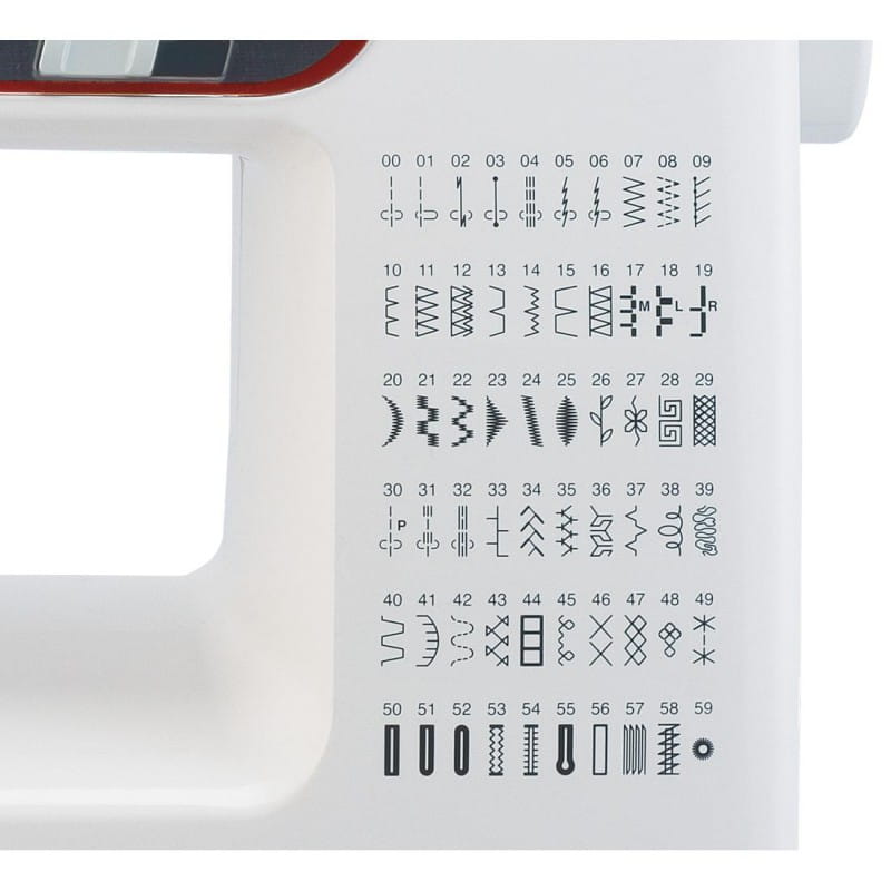 60 dostępnych programów ściegowych, w tym ściegi proste, użytkowe, owerlokowe, kryte, satynowe, ozdobne i dziurki