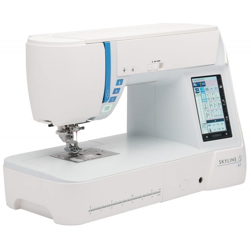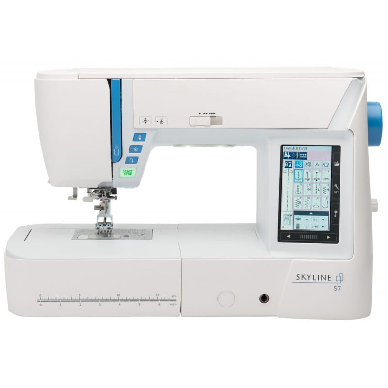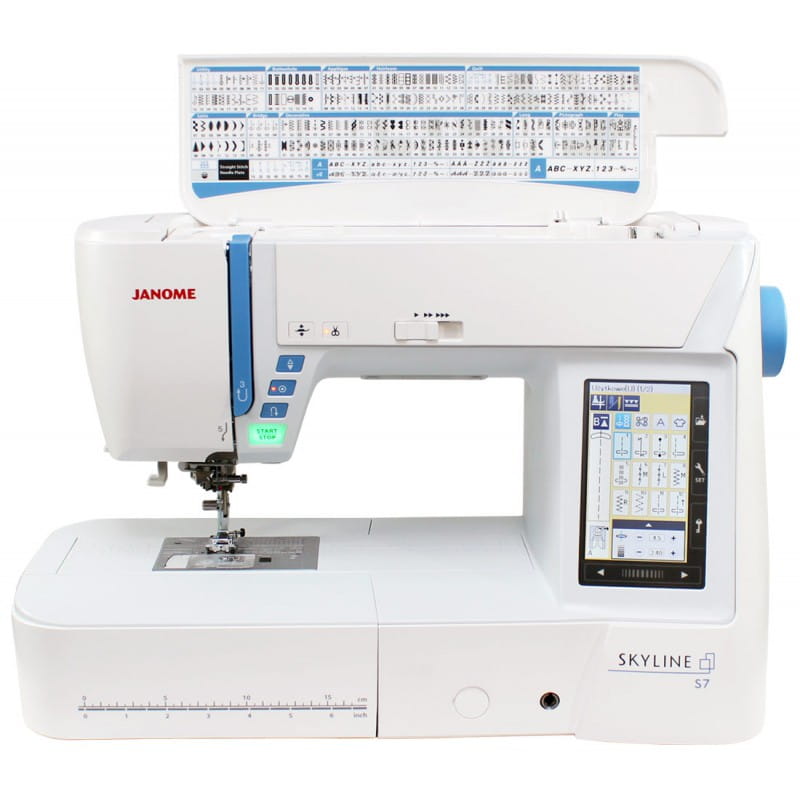 Maszyna Skyline S7 to wysokiej klasy komputerowy, nowoczesny model. Posiada ona duży, kolorowy wyświetlacz, który zapewnia szybki i wygodny dostęp do ważnych funkcji i ustawień. Menu jest wyłącznie w języku polskim, co ułatwia w pełni poznanie wszystkich możliwości maszyny. Inaczej niż w standardowych maszynach domowych Janome Skyline S7 jest znacznie większa (odległość pomiędzy igłą, a ramieniem maszyny to 21 cm), a w połączeniu z automatycznym podnoszeniem i opuszczaniem stopki daje to duży komfort podczas szycia. Maszyna ma aż 580 programów ściegowych, w tym m.in.: ściegi proste, kryte, stretch, zygzak, satynowe, owerlokowe, ozdobne, drabinkowe, mostkowe, drzewkowe, potrójnie wzmacniane, dziurki (jest ich 11 rodzajów) i 3 kroje alfabetu zawierającego polskie litery i znaki specjalne. Model posiada też program do projektowania własnych ściegów (Stitch Composer), a zatem liczba programów ściegowych jest nieograniczona.