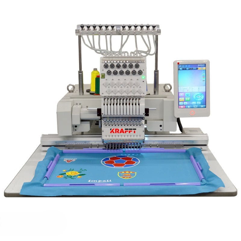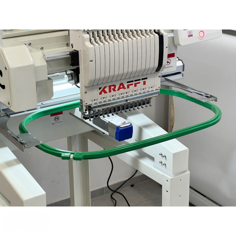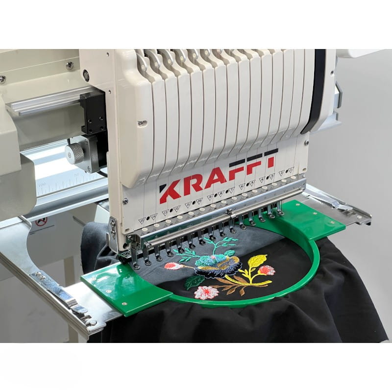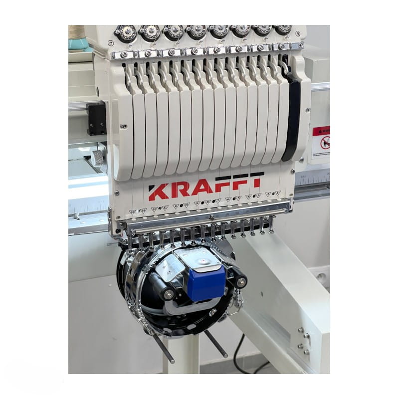 KRAFFT KF-CT1501H to nowoczesna, kompaktowa hafciarka przemysłowa, która łączy w sobie profesjonalne możliwości z łatwością obsługi. Wyposażona w 15 igieł oraz 1 głowicę, umożliwia haftowanie wielokolorowe, w tym również na czapkach i gotowych elementach odzieży. Dzięki możliwości pracy zarówno na powierzchniach płaskich, jak i cylindrycznych, urządzenie doskonale sprawdza się w zakładach odzieżowych, pracowniach reklamowych i punktach usługowych. Hafciarka obsługuje także efekt haftu 3D, nadając projektom wyjątkowy charakter. Na tle typowych hafciarek przemysłowych wyróżnia się kompaktową budową, ale solidną konstrukcją o dużej wytrzymałości. Wykonuje hafty na dowolnych, różnorodnych materiałach, od delikatnych tkanin przez materiały twarde i grube. Wyposażona została w energooszczędny silnik servo, który zapewnia prędkość haftowania do 1200 ściegów/min. Funkcja automatycznej kontynuacji haftowania po zaniku napięcia gwarantuje bezpieczeństwo pracy i oszczędność czasu. Duży, 10-calowy, kolorowy panel dotykowy z menu w języku polskim ułatwia konfigurację i obsługę maszyny. Oprogramowanie podzielone jest na 4 czytelne podmenu ekranu.