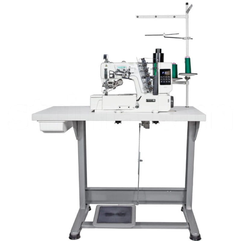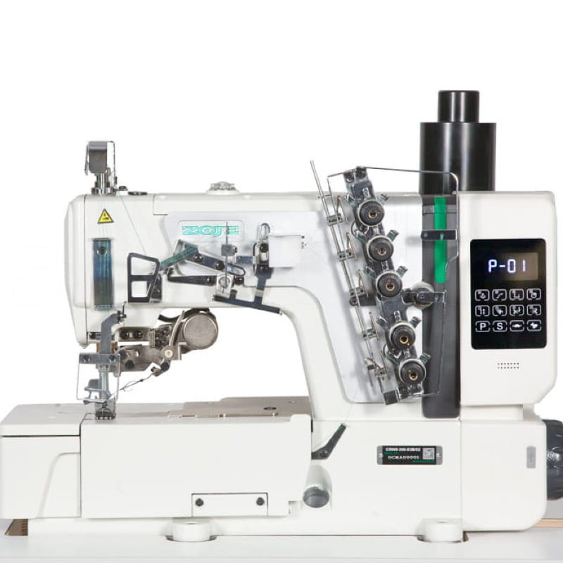 ZOJE C5000-356-D3C-02 to 3-igłowa 5-nitkowa renderka (renderówka) z płaskim łożem, transportem dolnym różnicowym, elektromagnetycznym obcinaniem nici i automatycznym pozycjonowaniem igieł. ZOJE C5000-356-D3C-02 przeznaczona jest do szycia lekkich i średnich materiałów o maksymalnej prędkości szycia do 5000 ściegów/min. Rozstaw igieł w tym modelu to 5,6mm, a maksymalna długość ściegu to 4,5mm. Maszyna pozwala na szycie klasycznym ściegiem drabinkowym z włączonym lub wyłączonym dekoracyjnym górnym przeplotem. Podnoszenie stopki na wysokość 5mm. Wyposażona w centralny układ smarowania. Maszyna posiada elektromagnetyczny system obcinania nici działający na dwa sposoby: